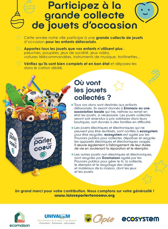 Comme chaque année la commune participe à l’opération « Laisse Parler Ton Cœur », grande collecte de jouets d’occasion organisée par Ecosystem et Ecomaison, en partenariat avec Univalom, du 22 au 30 novembre.