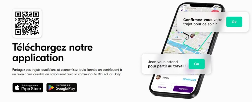 - Téléchargez l’application de covoiturage BlaBlaCar Daily : disponible gratuitement sur Apple Store et Google Play.